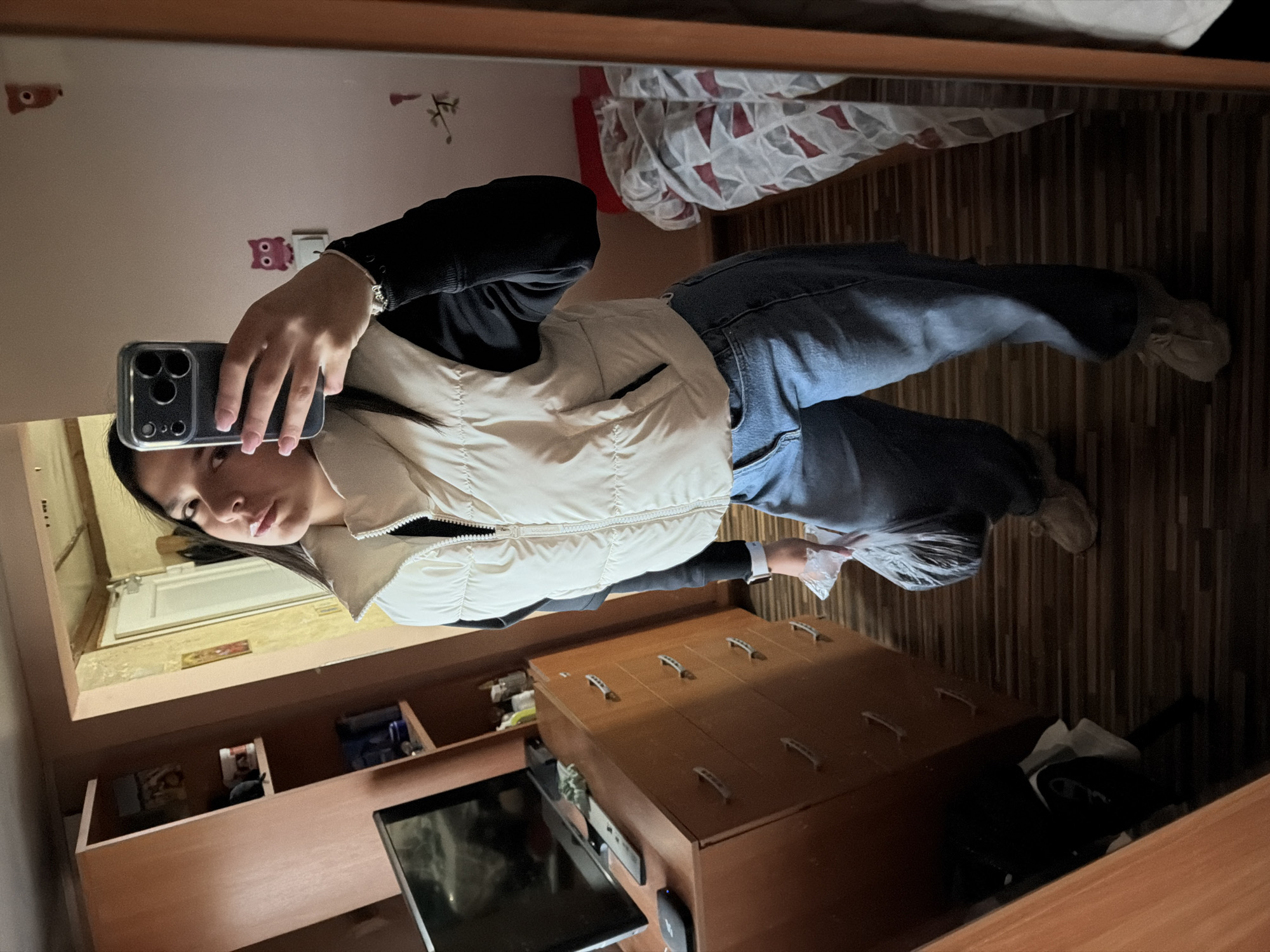 A person stands in front of a mirror, holding a smartphone to take a selfie. The individual has dark hair, wears a white vest over a dark top, and blue jeans. The background includes furniture, a bed, and a TV. The location is inferred to be Balinovtsi, Bulgaria based on available data, although it cannot be visually confirmed.