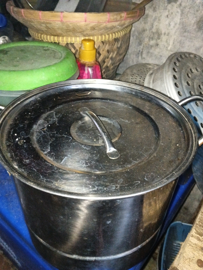 The scene depicts a domestic storage or kitchen area in Kampung Buang Abai, Malaysia. A large, stainless steel cooking pot with a lid, showing water stains and residue, occupies the central foreground, resting on a blue plastic surface. The lid features a silver-colored handle. To the left, a green plastic container with a bright green lid is visible, partially obscuring the top of a blue bottle. A clear bottle containing pink liquid, topped with a yellow pump dispenser, is positioned behind the green container. In the midground, a woven bamboo basket with red and yellow accents is situated against a light-colored, textured wall. Adjacent to the basket, several round, perforated metallic objects, consistent with steamer components, are stacked. A segment of a wooden surface is visible in the lower right of the frame, alongside a partially obscured blue object, possibly a utensil or container. No individuals are present, and all objects appear stationary.