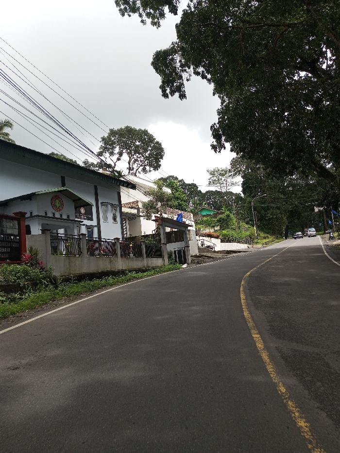 The image depicts a curved asphalt road ascending gently under an overcast sky, located in the city of Serpang Shalli, Bhutan. The road occupies the lower half of the frame, featuring a solid white line along its left edge and a solid yellow line separating the main lane from a right-side shoulder. On the left, a narrow strip of green grass and low vegetation borders the road, leading to a series of structures. A prominent multi-story white building with a dark gabled roof stands on an elevated foundation. Its front facade features a circular green emblem with white details, positioned above a small, dark-roofed porch. A dark metal-barred fence surmounts a light-colored concrete retaining wall in front of this building. To its immediate left, a reddish-brown sign displays partially legible white text, including characters that appear to form "GEREJA" and "SEMARANG." Multiple black utility lines traverse the upper-left quadrant above the buildings. Further right along the road, another white building with a patterned wall and a similar fence is visible. The terrain behind these structures slopes upwards, densely covered with trees and additional, partially visible buildings, some with green roofs. The right side of the road is flanked by a steep, heavily wooded slope with dense green foliage. The road curves to the right and continues its ascent. In the mid-distance on the right lane, three vehicles are visible traveling away from the viewer: a white van or SUV followed by two darker sedans or SUVs. A motorcycle is partially parked on the far right shoulder. Tall, mature trees with dense green canopies line this side of the road, some overhanging the pavement. A utility pole with blue and white flag-like attachments is present on the far right. The sky is uniformly overcast, predominantly light gray with some darker cloud formations.