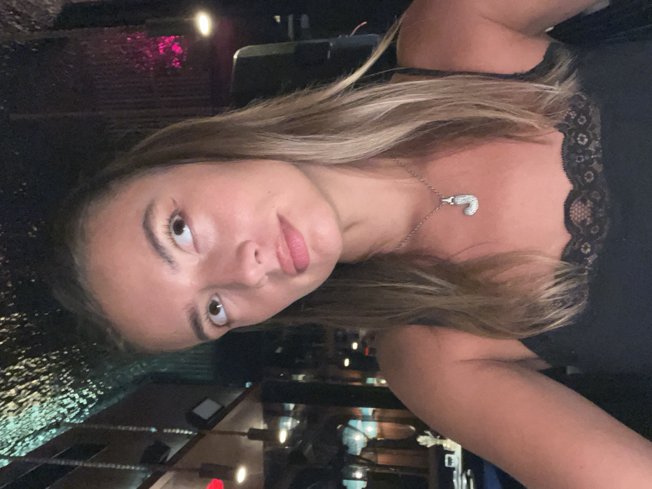 A female individual is depicted from the chest up, positioned slightly right of the frame's center, with her gaze directed upwards and to her left. She has light skin, brown hair with lighter highlights, and is wearing a black camisole with a lace trim along the neckline. A silver-toned chain necklace with a 'J' shaped pendant, adorned with small clear stones, is visible on her chest. The setting is a dimly lit interior space in Tibubeneng, Indonesia, consistent with a restaurant or lounge. The ceiling features a textured surface illuminated by a greenish-blue light. Various light sources are present in the background, including a red light on the left, ambient lighting illuminating partially visible seating and tables on the far left, and a prominent pink light source or reflection visible towards the upper right. The subject maintains a neutral facial expression.