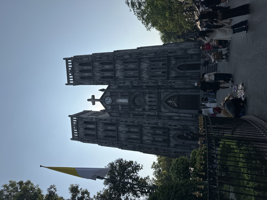 The image displays St. Joseph's Cathedral (Nhà thờ Lớn Hà Nội) in Hà Nội, Vietnam, under a bright, clear sky. The cathedral, a large Gothic Revival structure, dominates the central frame, characterized by its two tall, dark-toned towers, a central facade featuring a rose window, a clock, and a crucifix at its highest point. The sun is positioned behind the crucifix, creating a strong backlighting effect that silhouettes the cathedral. To the left of the cathedral, a flagpole displays a vertical bicolour flag, yellow over white, representing Vatican City. In the foreground, a black metal fence with gold-colored decorative tops runs horizontally, separating a landscaped area with dark green foliage from a paved pedestrian space. Numerous individuals are present on this paved area in front of the cathedral. One person, wearing a hat and dark clothing, is crouched near the fence, attending to a small, ground-level display of items. Other people are walking or standing; a couple is visible in the center, and a female in a light-colored long-sleeved top is holding a smartphone in a raised position, possibly taking a photograph or video. Further back and to the right, additional individuals are observed, some with strollers. Dark green trees partially frame the cathedral on both sides.