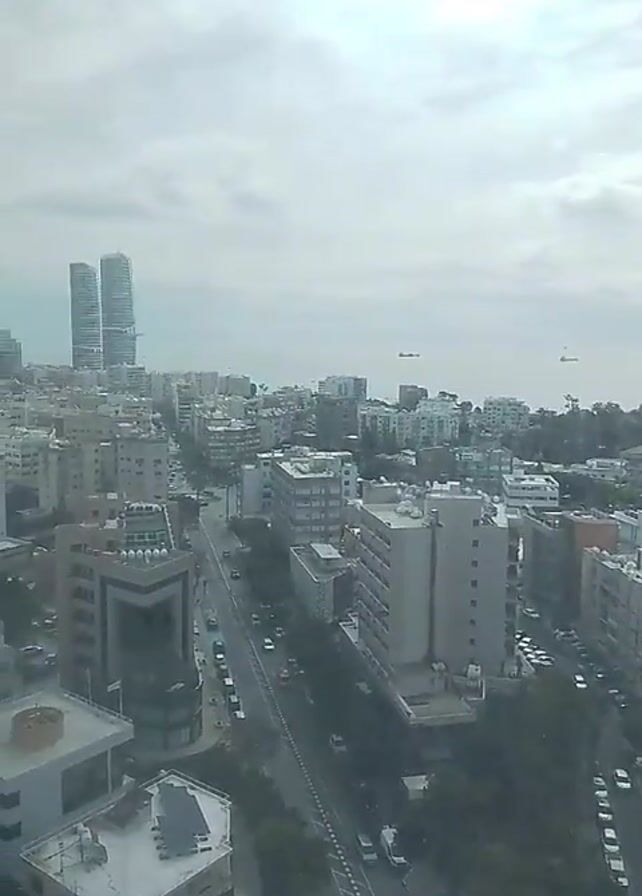 high-angle, daytime view of an urban landscape. The sky is overcast and gray, with a flat, even cloud cover. Below, a dense collection of buildings, mostly gray and white in color, stretches toward the horizon. A main road bisects the foreground, with vehicles moving along it and parked on the sides. In the distance, the sea is visible, with several ships or boats dotting the horizon. On the left side of the frame, two tall, modern skyscrapers rise above the other buildings. The overall impression is of a densely populated city under a cloudy sky.