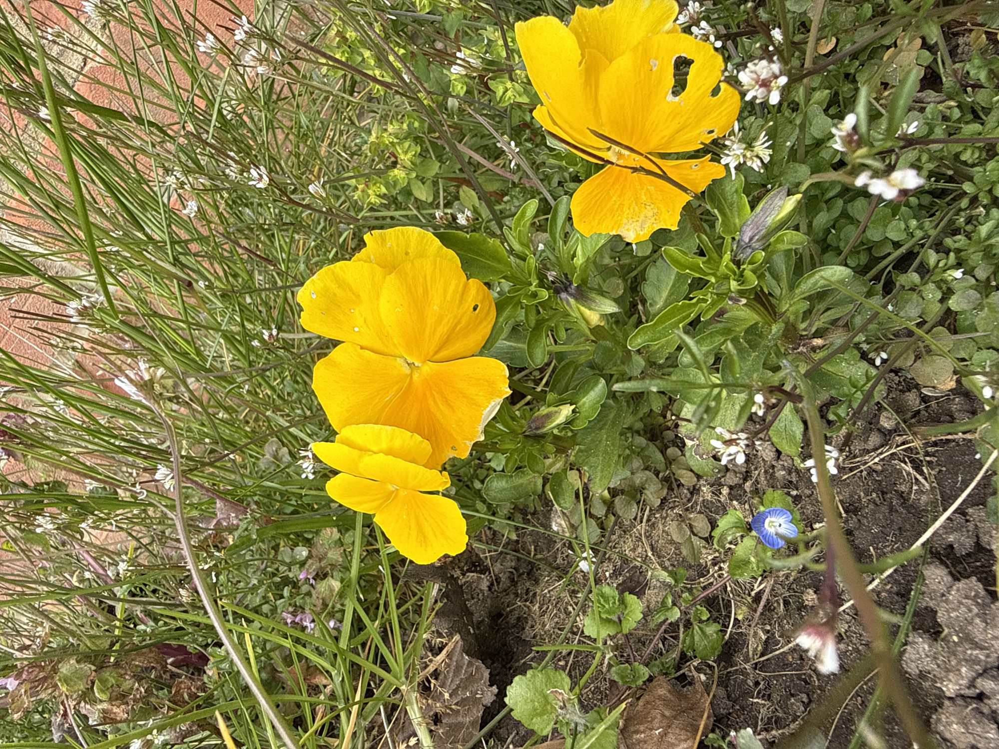 The image displays a close-up, ground-level view of a patch of garden flora in Gorleston-on-Sea, United Kingdom. Three vibrant yellow pansy-type flowers are prominent. The leftmost and central yellow flowers are fully open and appear intact. The rightmost yellow flower is also fully open, but exhibits a small, irregularly shaped perforation on one of its lower right petals. Surrounding these primary subjects is a dense assortment of green herbaceous plants, including various grasses and broad-leafed weeds. Numerous small, white-petaled flowers are visible scattered throughout the green foliage, particularly in the upper right and lower right sections. A single, small blue five-petaled flower with a white center is present in the lower-middle left of the frame. A closed, purple-tinged flower bud is visible beneath the central yellow flower. Patches of dark, moist soil are visible on the ground, interspersed with dried brown plant debris. In the upper background, partially obscured by the dense vegetation, a blurred reddish-brown textured surface, consistent with a brick wall or similar structure, is discernable. No people, animals, or artificial objects are otherwise visible.