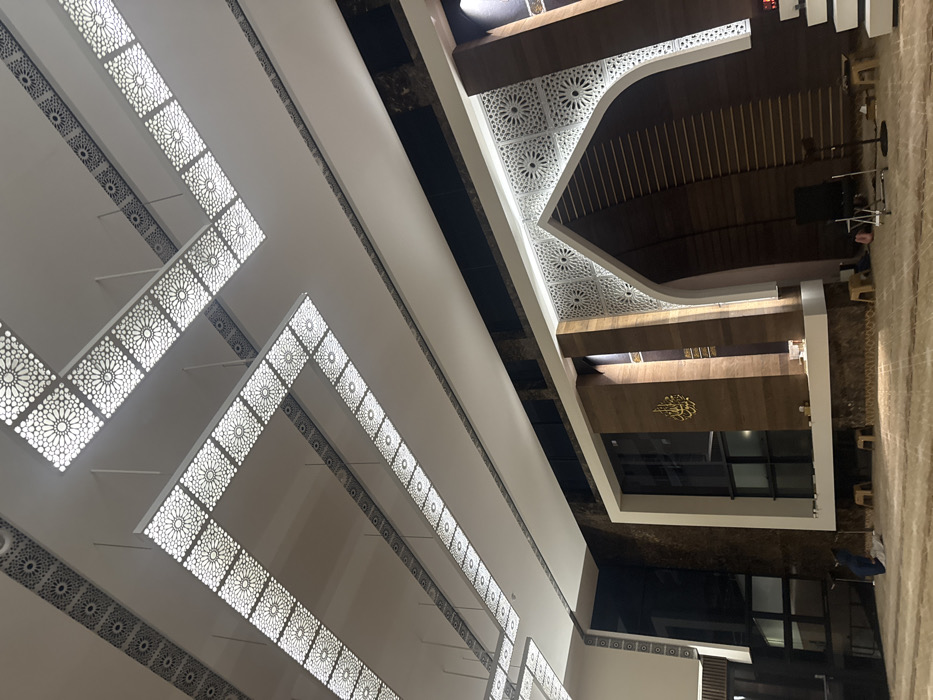 The image displays the modern interior of a mosque located in Durban, South Africa. The scene is illuminated by an extensive ceiling system featuring white rectangular panels arranged in linear and L-shaped configurations. These panels exhibit intricate, backlit geometric patterns. Darker decorative strips with similar patterns are integrated into the ceiling design. The architecture includes prominent walls clad in varying shades of brown and dark patterned stone, contrasted with lighter wooden panels. A large arched structure, likely a mihrab, is visible on the right, defined by a white, illuminated geometric latticework border and an interior clad in horizontal wooden slats. To the center-left, a section features a framed structure with dark glass windows and wooden cladding, upon which a golden Arabic calligraphy inscription is mounted. The floor is covered with a light-toned, patterned carpet. Scattered throughout the foreground are several small, light-colored wooden stools. One black folding chair and a microphone stand are positioned near the mihrab area. A multi-tiered white structure is partially visible on the far right. A single individual, dressed in dark clothing, is observed kneeling on the carpet in the lower-left quadrant, facing towards the front architectural elements, indicative of prayer. The overall lighting is bright and integrated into the architectural design.