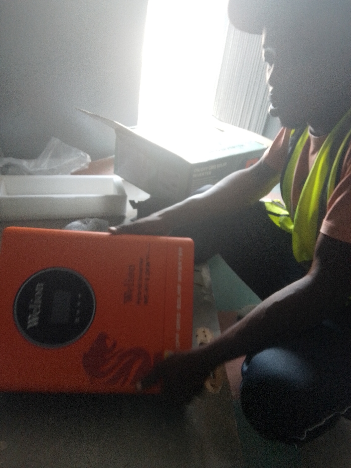 The scene, located in Offatedo, Nigeria, depicts an indoor environment with a single individual interacting with electronic equipment. A male figure, wearing a baseball cap, an orange t-shirt, and a neon green reflective safety vest, is crouched on the right side of the frame, heavily backlit by a bright light source in the upper center. His face is in shadow. In the foreground, an orange rectangular device labeled "Welion ON/OFF GRID SOLAR INVERTER" with a circular display screen is positioned horizontally. The individual's hands are near this inverter, suggesting an examination or preparation. Behind the inverter, an open cardboard box with visible text matching "ON/OFF GRID SOLAR INVERTER" and a white styrofoam packaging insert are present. A clear plastic bag lies adjacent to the styrofoam. The background features a light-colored, vertically-patterned wall. The floor is a flat, worn surface.