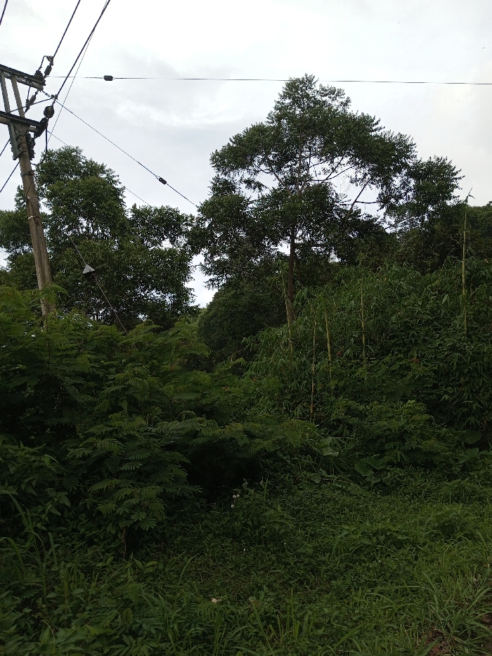 The image displays an outdoor scene in Matale, Sri Lanka, under a heavily overcast sky. The foreground and midground consist of dense green vegetation, including various grasses, shrubs, and several light green bamboo shoots rising vertically on the right. A weathered wooden utility pole is positioned on the far left, extending upwards and supporting multiple dark overhead electrical or communication wires that traverse the upper portion of the frame. Numerous dark green trees dominate the midground and background, forming a continuous, dense canopy, with one particularly large tree featuring a broad, rounded crown visible towards the center-right. No individuals, actions, or specific interactions are visible within the frame.