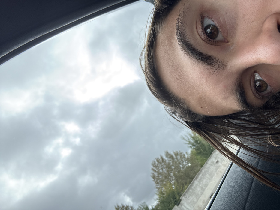 The image displays a close-up, low-angle shot focusing on the upper portion of a single individual's face, specifically their right eye, part of their left eye, forehead, and dark brown hair, which appears damp or wet and styled back. The individual has brown eyes. The scene suggests the person is inside a vehicle, evidenced by dark interior trim visible on the far left and right sides of the frame. Through the vehicle's window, an overcast sky with dense, light-gray clouds dominates the upper half of the background. To the left, a light-colored concrete or stone barrier runs horizontally, with green and brown deciduous trees and bushes visible behind it, indicating a roadside or elevated roadway environment. No specific landmarks or architectural features are present in the image to identify the location as Bologna, Italy.