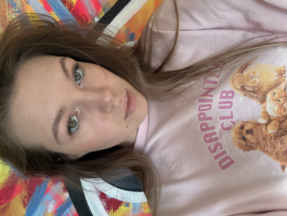 A close-up, frontal portrait depicts a young adult female with light brown hair and light green eyes, featuring light green eyeliner on her lower lash line. She exhibits a neutral facial expression, looking directly forward. A small mole is present on her upper lip to the viewer's right. She is wearing a light pink long-sleeved top. The garment displays the text "DISAPPOINTED CLUB" in pink capital letters, beneath which are printed images of a brown puppy on the left, a light brown floppy-eared rabbit on the right, and a small ginger kitten lying on its back in the center, all surrounded by scattered white star-shaped graphics. The background consists of an abstract, brightly colored artwork with broad strokes of red, yellow, blue, and black paint, including a distinct black and white curved stripe. This scene is situated in the Vozdovac Urban Municipality, Serbia.