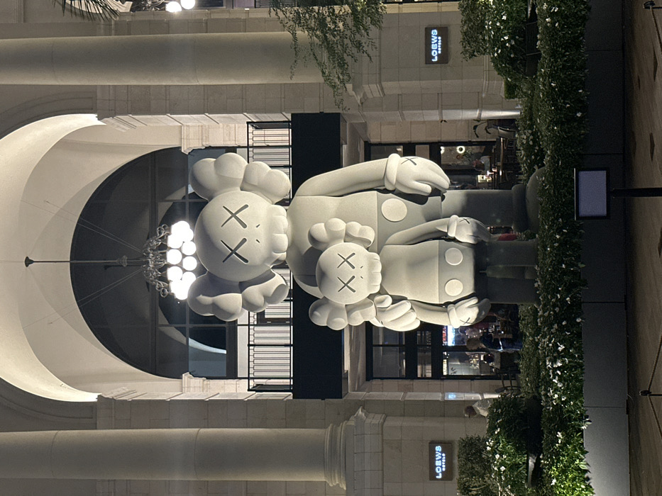 The image displays an outdoor plaza at night in front of the Loews Coral Gables Hotel, located at 2800 Ponce de Leon Blvd, Coral Gables, Florida, United States. The central subjects are two monumental grey sculptures by artist KAWS, depicting stylized humanoid figures with "XX" for eyes. A larger figure stands with its left arm around the shoulders of a smaller figure beside it. The sculptures are positioned on a paved surface, fronted by a low, dark planter containing green foliage and small white flowers. The background features the hotel's Mediterranean Revival architecture, comprising large, light-colored stone columns and arched alcoves. A multi-bulb chandelier hangs from the ceiling within the main archway, directly above the sculptures. Below the archway, a dark balcony with a railing is visible at an upper level. The ground floor of the building behind the sculptures features large glass windows, revealing several indistinct human figures seated at tables within, suggesting a restaurant or lounge area. Two illuminated "LOEWS HOTELS" signs are mounted on the building's facade, one on the left and one on the right, flanking the central architectural features. The entire scene is illuminated by artificial lighting, highlighting the architectural details, the sculptures, and the surrounding landscaping. A dark, blank rectangular sign on a slender post is present in the lower right foreground.