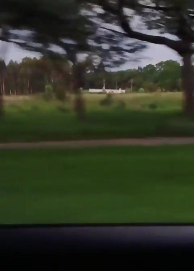 view from inside a moving vehicle, looking out at a grassy landscape. The foreground consists of the interior of the vehicle, including the dashboard and the door frame. The focus is on the scenery outside the window, which consists of a field of green grass, a narrow paved area, and trees. A cluster of trees and a small white building can be seen in the distance under a cloudy sky. The camera moves with the vehicle, blurring the scenery as it passes. The overall lighting suggests it is daytime, but perhaps overcast.