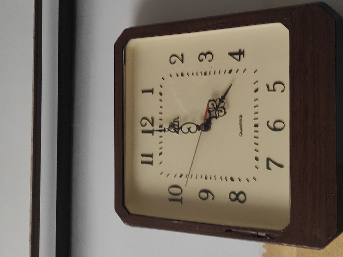 - "A close-up, slightly angled shot captures a rectangular wall clock with a dark brown wooden frame and a cream-colored face" by FM-oaYm93, licensed under CC BY 4.0