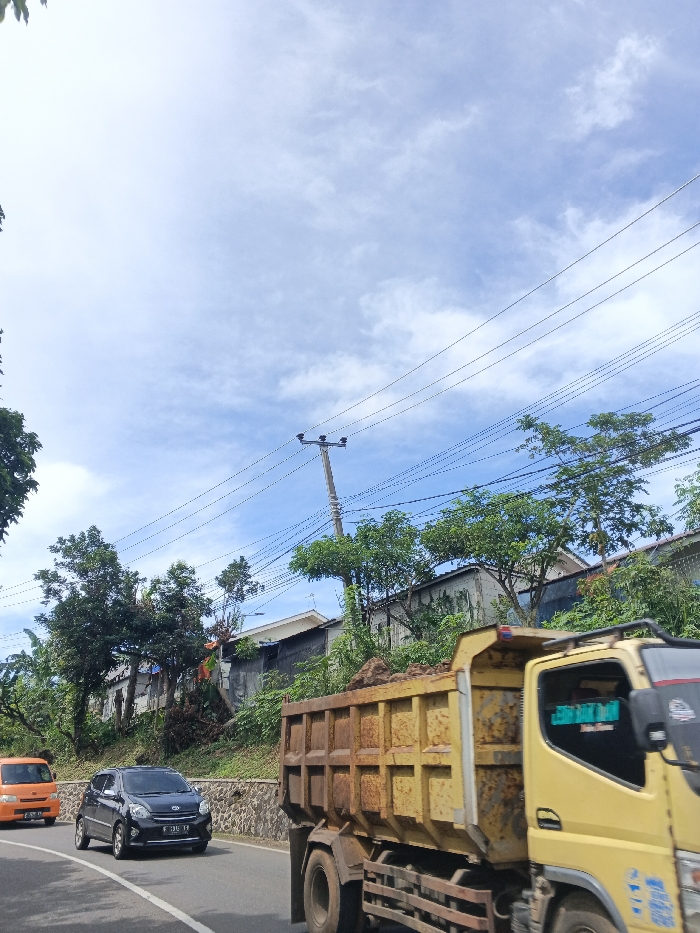A yellow dump truck loaded with dirt moves along a road. In the background, a black compact car follows an orange vehicle. Houses are visible on a hillside behind a stone retaining wall, and trees line the roadside. Power lines stretch across a bright, partly cloudy sky. The scene suggests a road construction site or ongoing hauling activity in a residential area.
