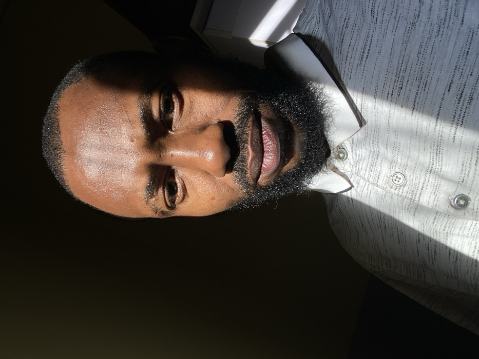 A man with dark skin, a trimmed black beard, and brown eyes faces the viewer