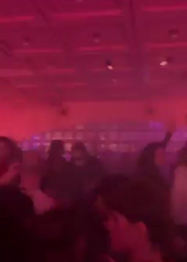 crowd of people in a dimly lit room, likely a nightclub or party venue. The lighting is predominantly purple, with some brighter spots. People are standing and moving, with some raising their arms in the air, possibly dancing or celebrating. The camera angle is from within the crowd, giving a sense of immersion. The background features what appears to be a textured or patterned wall.