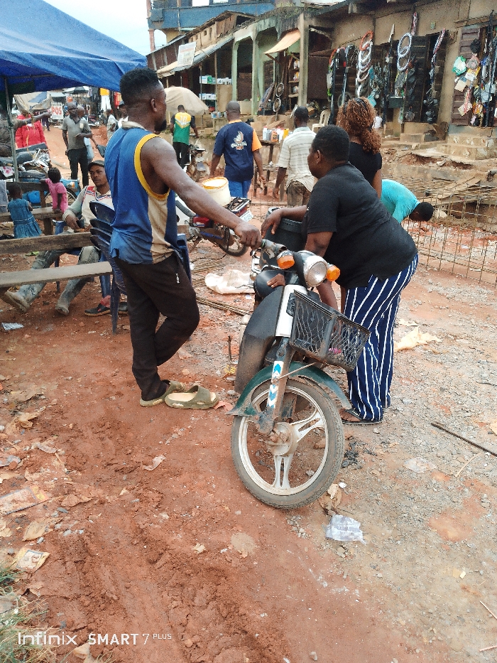 A motor scooter sits on a muddy street near a bustling market. Two people lean on the scooter, one in a blue and yellow tank top, and the other in a black shirt and blue and white striped pants. Behind them, people walk along the street lined with shops selling various goods. The ground is a mix of red dirt and scattered debris. The sky is overcast, suggesting a cloudy day.