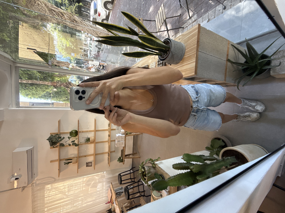 A female individual is depicted in a full-length mirror selfie taken inside a commercial establishment. Her face is obscured by the light grey-cased iPhone she holds with her right hand, taking the photograph. She wears a brown tank top, light blue denim shorts, and grey sneakers, with a silver chain necklace visible on her chest. The indoor environment features white walls and a light grey floor. To the left, a light wooden table is accompanied by two black stools. An air conditioning unit and a white security camera are mounted high on the wall. A multi-tiered light wooden shelf unit along the rear wall displays various potted plants, including cacti and trailing vines, alongside small packaged items. A low wooden bench below the shelves also holds packaged goods. Two large potted plants, a tall cactus and a shorter leafy plant, are visible on the floor near the left side of the mirror. To the right of the individual, a potted Sansevieria (snake plant) rests on a counter constructed from light wood and concrete blocks. A dark metal outdoor chair is visible beyond the counter, suggesting an outdoor seating area. Another potted plant, resembling aloe vera, is situated on the floor at the bottom right. Through the large storefront windows, an urban street scene is visible under daylight conditions. The street features parked and moving vehicles, including white SUVs, and pedestrians, one pushing a stroller. Reflections on the glass storefront distinctly show Hebrew text, "עבודת יד סדנאות," which translates to "Handmade Workshops." Based on this linguistic detail, the location is identified as Tel Aviv, Israel. Tall trees line the street outside the establishment.