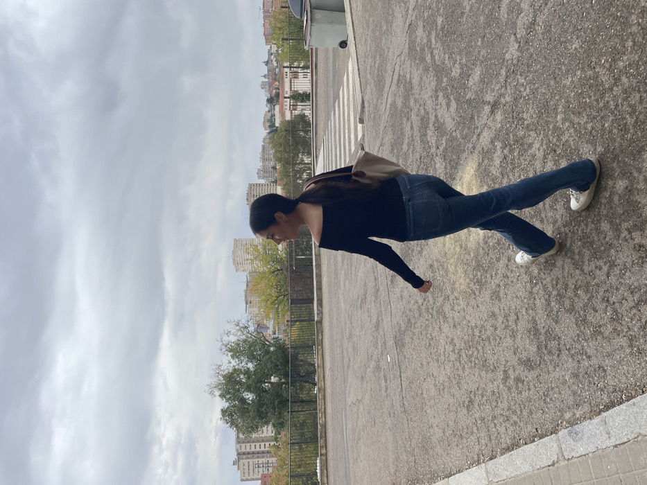 An outdoor scene in Madrid, Spain, depicting a young adult female walking on a paved road under an overcast sky