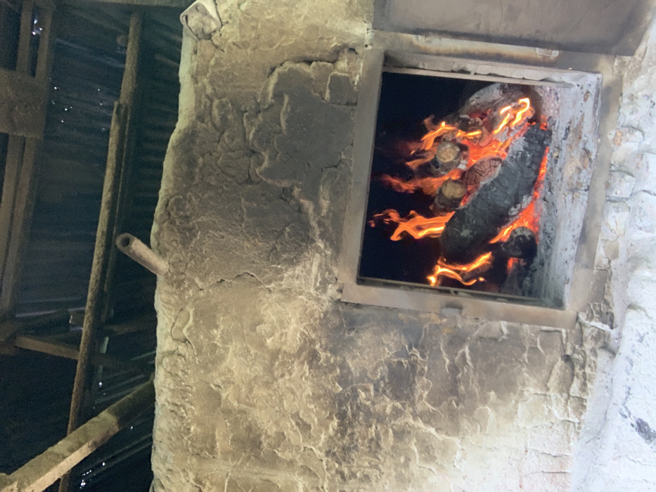 A large, utilitarian oven or furnace, constructed from light-colored, textured material resembling mud or concrete, occupies the foreground