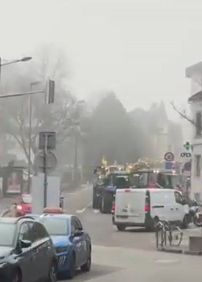 line of tractors driving down a street in what appears to be a European city