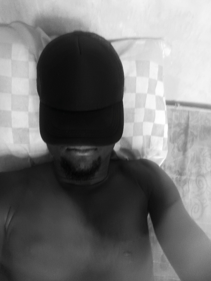 A shirtless person lies on a bed, obscured from the eyes up by a black baseball cap. The person has a goatee. A checkered pillow supports the head. An adjacent pillow features a floral pattern. The image is in black and white.