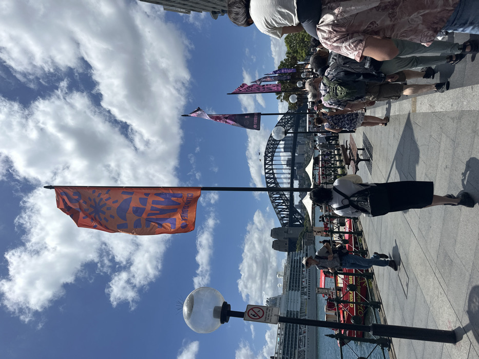 A view of Sydney Harbour under a blue sky dotted with fluffy white clouds. Several flags on black poles, some orange and some purple, line the waterfront. The iconic Sydney Harbour Bridge spans the background. People stroll along the paved walkway. A cruise ship is docked along the water's edge. A street lamp and a "no smoking" sign are visible in the foreground.