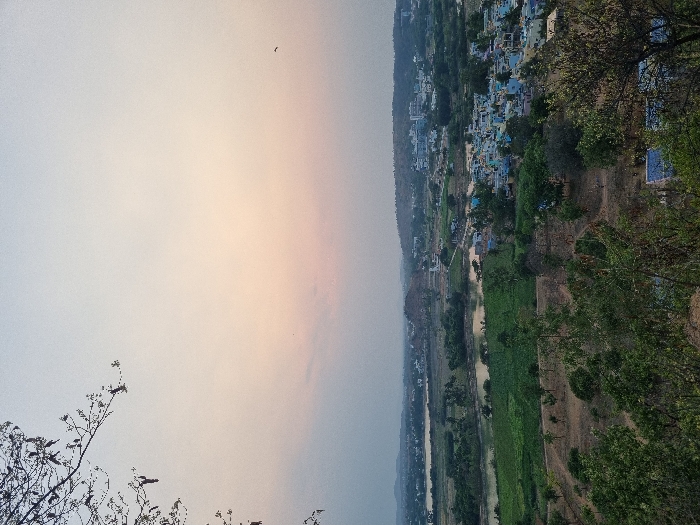 This image captures a wide-angle, elevated perspective of the area surrounding Koyalaguttapalli, India, during late dusk or early evening. The sky occupies the upper half, displaying a gradient from light grey-blue at the zenith to a soft, pale pinkish-orange hue near the horizon, indicative of twilight conditions. A single dark, silhouetted bird is visible in flight in the upper right quadrant of the sky. In the upper left foreground, a bare tree branch with visible foliage and what appear to be seed pods or small clusters extends downwards, partially framing the scene. The landscape below is a heterogeneous mix of natural and built environments. In the mid-ground, a network of green agricultural fields and patches of drier, brown scrubland is present. Multiple elongated bodies of water, resembling lakes or reservoirs, are interspersed within this landscape, reflecting the subdued sky light. Further into the mid-ground and extending into the background on the right, a dense settlement, identified as Koyalaguttapalli, is visible. It comprises numerous closely packed buildings, many with light-colored roofs and walls, some appearing distinctly blue. Trees and vegetation are scattered throughout the settlement and the surrounding terrain. In the distant background, low-lying hills or elevated land masses delineate the horizon. No individuals or specific actions are discernible within the frame. The overall lighting is soft and diffused.