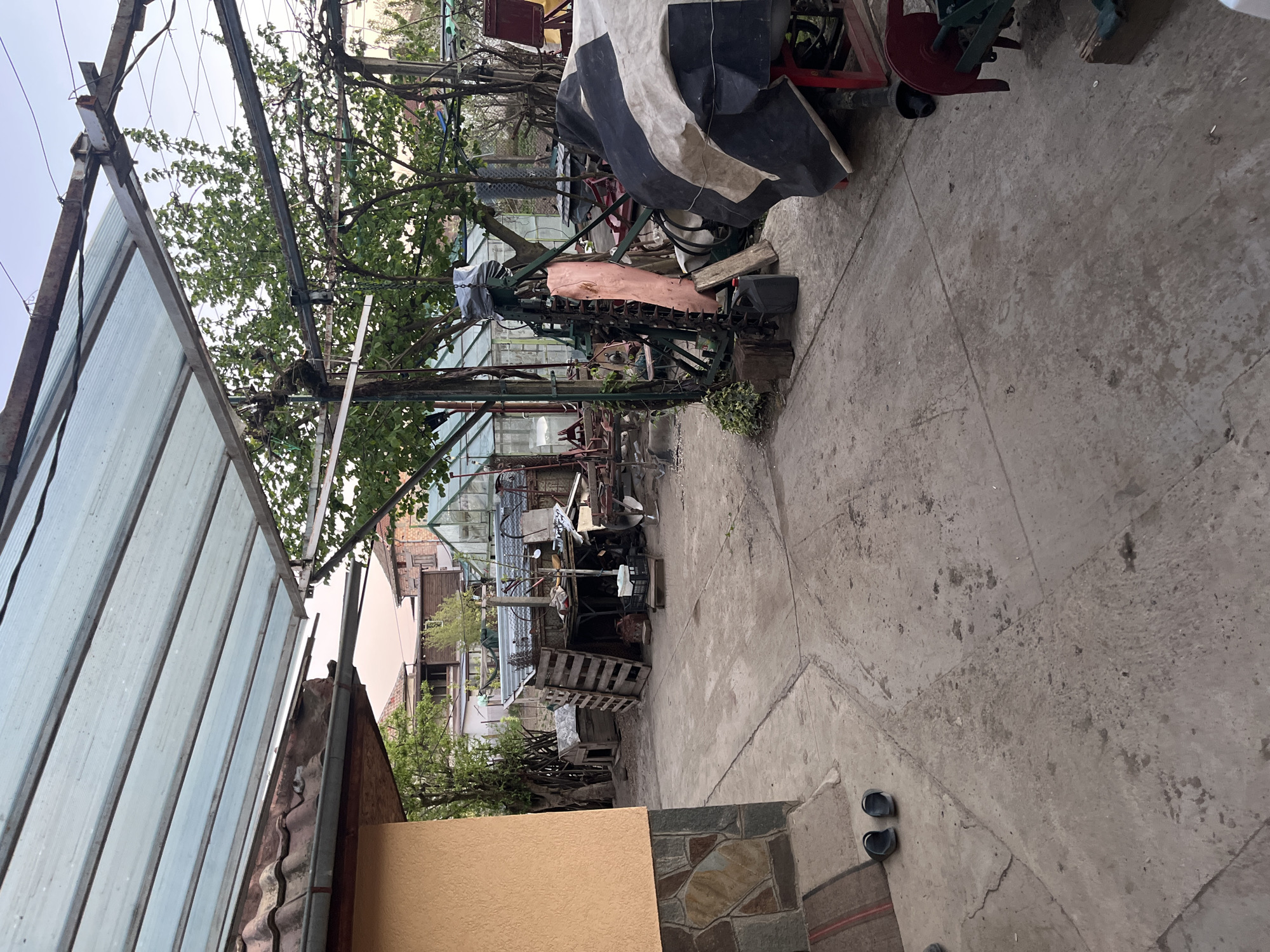 The image presents a cluttered backyard or courtyard in what appears to be a residential area. **Environment:** The setting is an outdoor space with a concrete ground. The scene appears to be Kran, Bulgaria, from information known about the origin of the image. A variety of plants and structures surround the open area. The sky is visible, suggesting the time of day is likely daytime. **Objects:** Overgrown vegetation is supported by trellises and metal structures. The yard is filled with a mix of items, including garden tools and other materials, covered in places by tarps. There is a small doghouse toward the back of the yard, partly obscured by various objects. Near the foreground, there is a portion of a building featuring a yellow wall and a stone-tiled area. A pair of black rubber sandals are on the ground near the wall. **People:** There are no people immediately visible in the scene. **Actions/Interactions:** No explicit actions are taking place in the visible frame. The scene suggests ongoing storage and accumulation of items in the backyard. **Overall:** The scene depicts a cluttered, possibly neglected, outdoor area, likely the backyard of a house, filled with miscellaneous items and equipment. The setting seems to be a relatively dense residential area, based on buildings seen through the foliage.