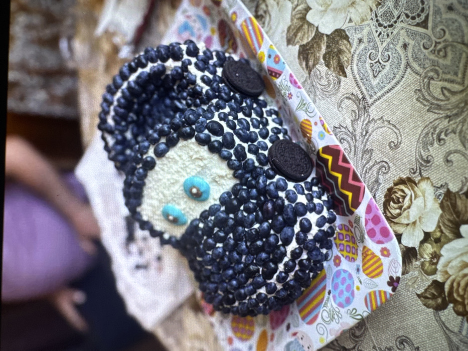 A car-shaped dessert, possibly a cake or pastry, is centrally positioned on a patterned napkin over a larger floral tablecloth within an indoor setting in Cherven Bryag, Bulgaria. The dessert is covered in white frosting, with its primary body and trim formed by numerous blueberries. Two light blue, circular candies with brown centers represent eyes on the front of the dessert. Two dark brown Oreo cookies are affixed to the side, serving as wheels. The patterned napkin beneath features various colored Easter egg motifs, stripes, and zigzag patterns. The tablecloth displays an ornate, faded beige and brown floral and damask design. In the blurred background, the torso and arm of an individual wearing a light purple short-sleeved garment are partially visible. Another white textile is partially visible behind the dessert to the left.