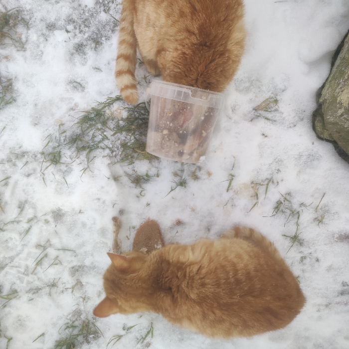 - "A high-angle forensic photograph depicts two orange tabby cats in a snow-covered outdoor environment, identified as Лунненскі сельскі Савет, Belarus" by FM-TzA0d2, licensed under CC BY 4.0
