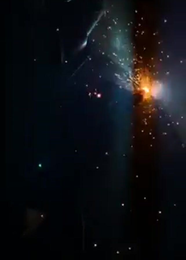 The video depicts a welding operation in a dark environment. A bright arc of light and numerous sparks are visible as a person welds metal together. The welder's arm and the welding tool can be seen. After the welding stops, a dim, orange glow remains at the weld site. A red tool and what appears to be a white container or material are also visible in the background.