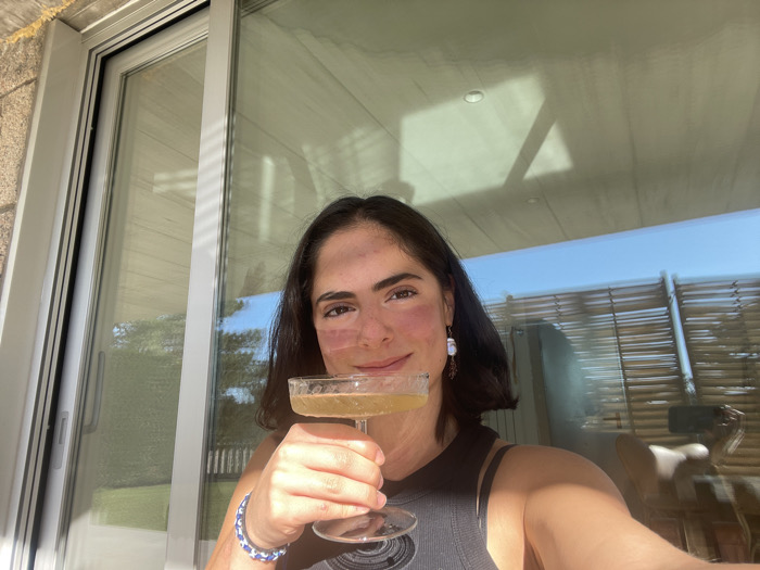 A female individual is depicted in a selfie, holding a stemmed coupe glass containing a pale amber liquid, positioned near her mouth