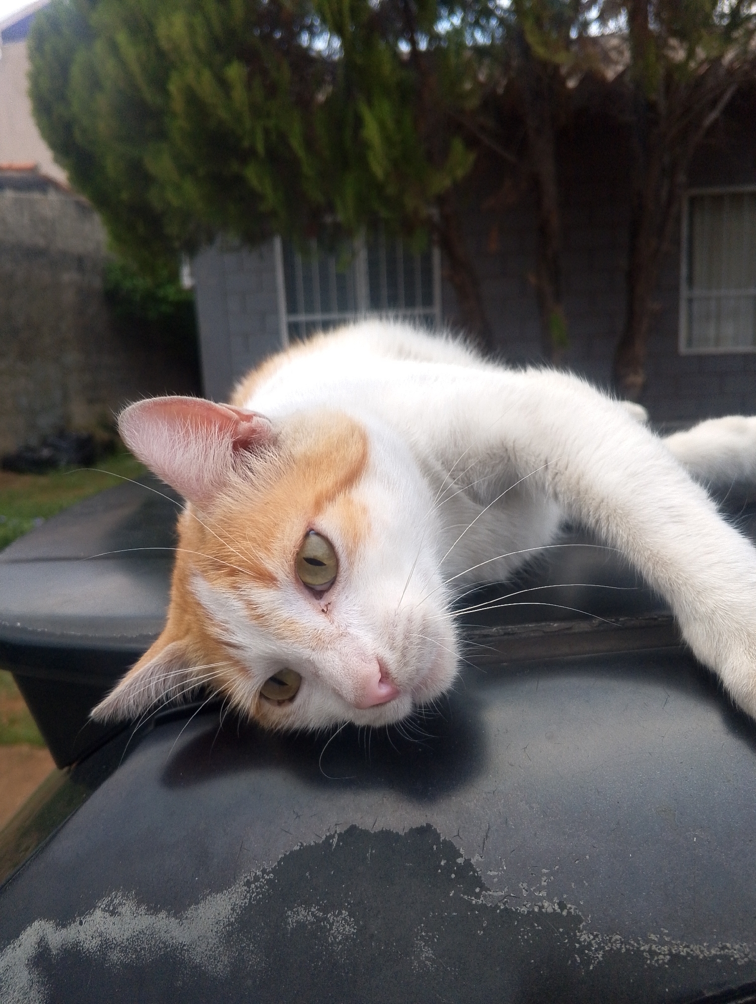 A close-up shot of an orange and white cat lying on a dark, worn surface, possibly the hood of a car. The cat's head is tilted, with its green eyes visible. A tree and a building with barred windows are visible in the background. The photo location appears to be an outdoor residential area. Given the prompt's instructions, the location is supposedly in the city of San Carlos, Venezuela.
