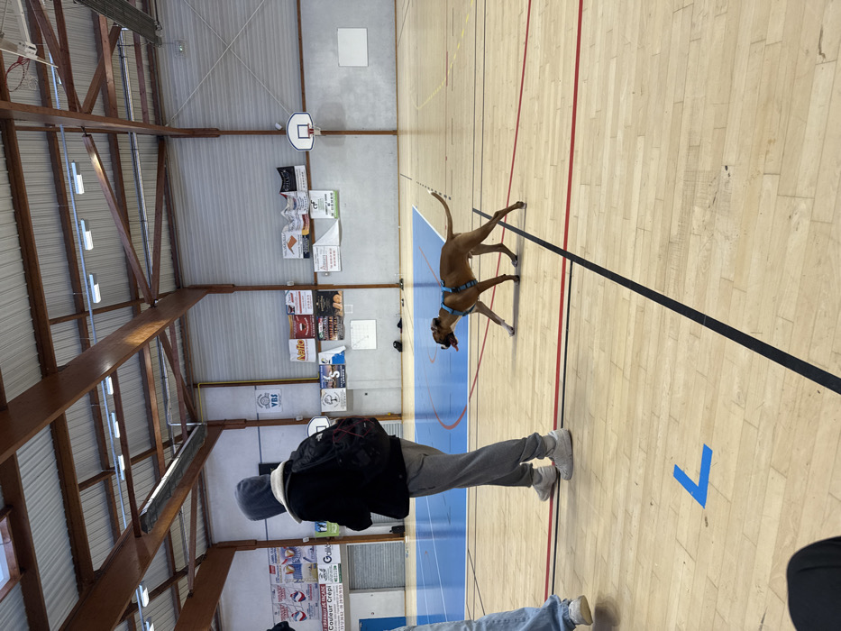 The image depicts an interior view of a gymnasium or sports hall in Sennecey-le-Grand, France. The flooring is light-colored wood with black, red, and blue court markings, including a large blue painted area in the background-left and a blue 'L' shape marked on the foreground-left. The walls are light grey, with corrugated metal paneling above, and numerous advertisements and signs, many in French, are affixed to them. A basketball hoop with a white backboard is visible on the right wall. The ceiling features exposed wooden beams and fluorescent lighting fixtures. In the midground, a person is walking away from the camera, wearing a dark hooded jacket with a light fleece lining, grey sweatpants, and white sneakers. They are carrying a black backpack with red accents. To their right, a medium-sized, fawn-colored dog, possibly a Boxer, is walking towards the right, wearing a light blue harness. Its tongue is visible, indicating panting. Partially visible on the far left are the lower legs and feet of another individual, wearing light-colored jeans and shoes. A dark garment or object is visible at the very bottom-center of the frame. In the background, on the blue court area, a pair of dark shoes is visible on the floor.