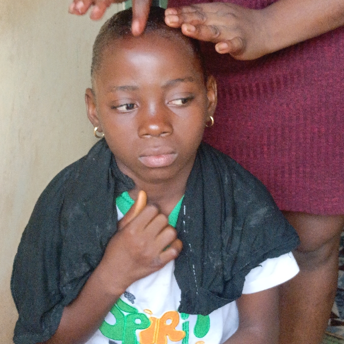 The image portrays an indoor scene in Akwanga, Nigeria, involving two individuals. In the foreground, a young person with dark skin and short hair, wearing a white t-shirt with green and orange lettering and a black cloth draped over their shoulders, is seated. They are equipped with gold hoop earrings and have an orange-brown substance on their right thumb. This individual gazes to the right with a neutral expression. Behind and to the right, an adult with dark skin, partially visible, is wearing a dark reddish-brown, ribbed garment. The adult's hands are positioned on the young person's head, appearing to be engaged in a hair-related activity. The background consists of a plain, light-colored wall on the left and a darker, textured surface on the right.
