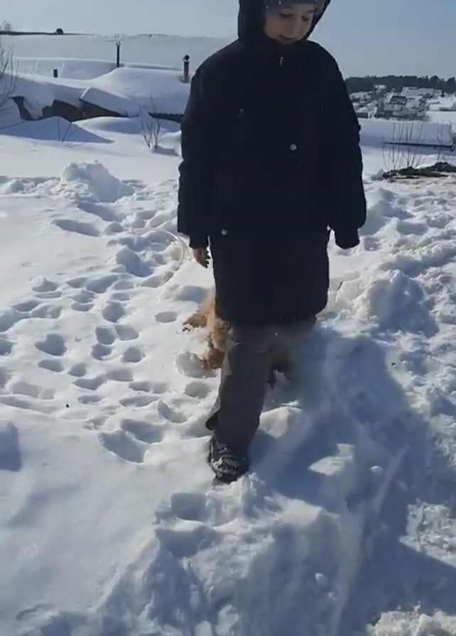 A child dressed in winter clothes stomps on a golden spaniel dog in the snow. The child is wearing a black jacket, gray pants, and snow boots, with a hood up. They are standing in a snowy field with houses visible in the background. The dog is lying in the snow and appears to be playful despite the stomping. The sky is bright and clear, indicating a sunny day.