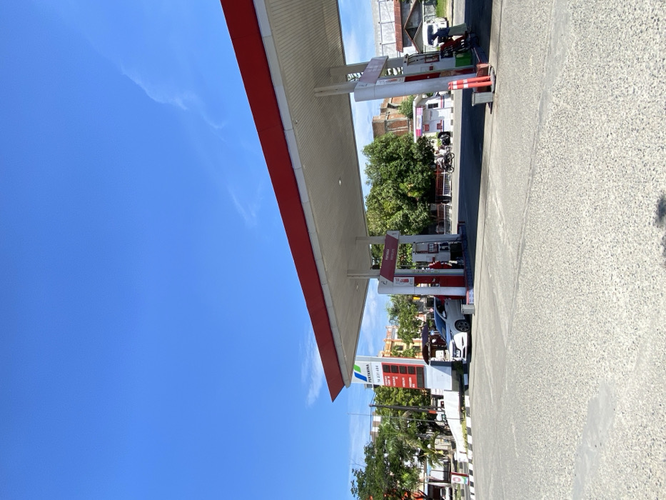 A petrol station with a red and white canopy dominates the right side of the frame