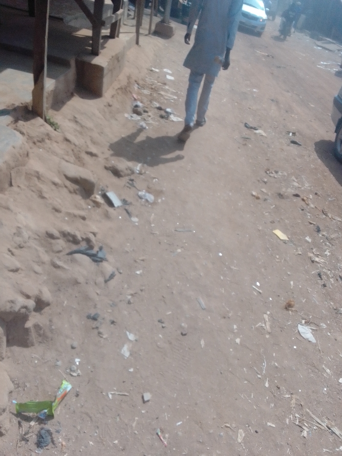 The scene depicts a daylight street view in Lapai, Nigeria. The foreground and midground consist of an unpaved, reddish-brown dirt road, heavily littered with various pieces of refuse including plastic, paper, and small debris. To the left, a portion of a raised concrete or mud foundation supports a multi-post wooden structure, possibly part of a building or stall. A male individual, viewed from behind, is walking away from the camera towards the upper right, casting a prominent shadow to his left. He is dressed in a light-colored, long tunic over light blue trousers and dark sandals. In the background, a white sedan and a motorcycle are partially visible on the dirt road, indicating vehicular traffic. A portion of another vehicle is visible on the far right edge of the frame. The area is brightly lit by direct sunlight.