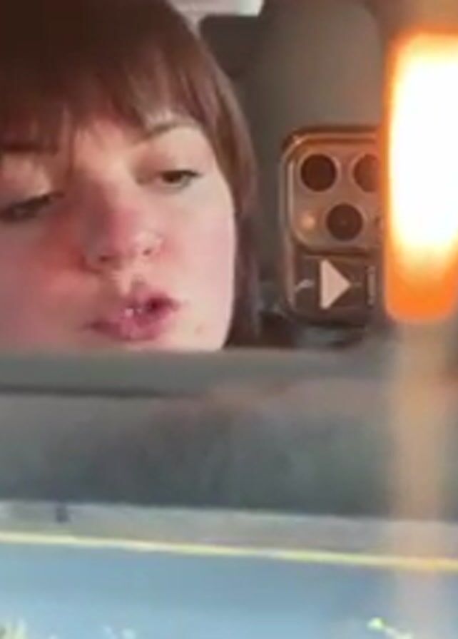 A woman with brown hair and bangs is looking at her reflection in a car's sun visor mirror. The mirror has two lights illuminated on either side. She is holding a smartphone with a patterned case up to the mirror to record or take a picture. The background shows greenery outside the car.