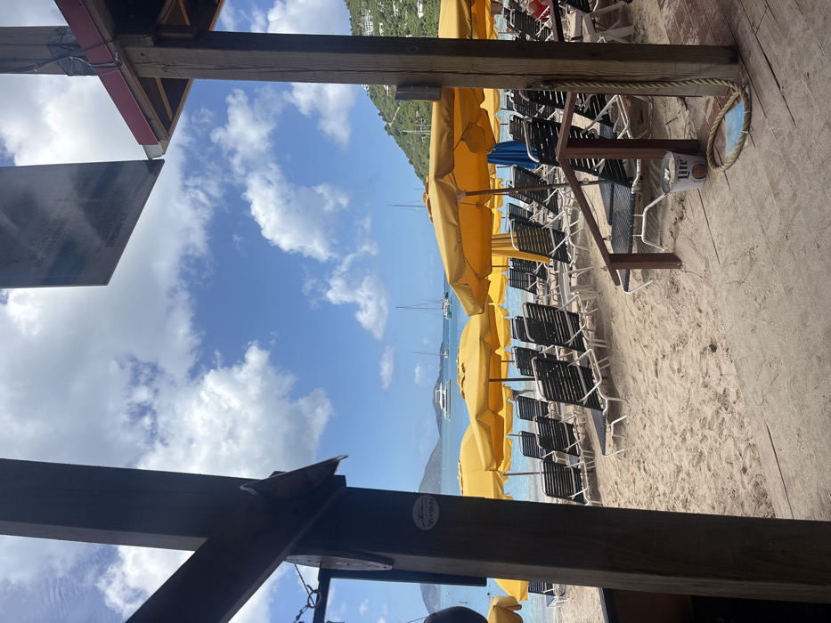 The image depicts a beachfront scene in Road Town, British Virgin Islands, observed from a shaded elevated wooden structure