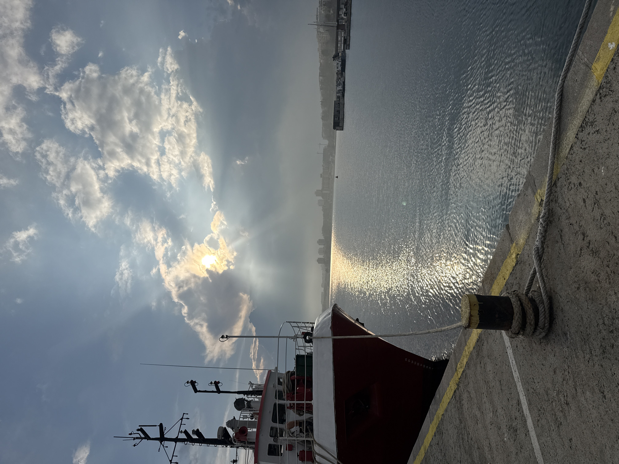 The image captures a docked vessel in Nesebar, Bulgaria. The vessel, primarily red and white, is moored to a concrete pier with a yellow safety line. A mooring bollard is present, securing the vessel. The water shows sunlight glinting off its surface, leading towards a distant cityscape obscured by haze. The sky is partially cloudy, with the sun breaking through, casting beams of light. The photograph is taken at an angle.