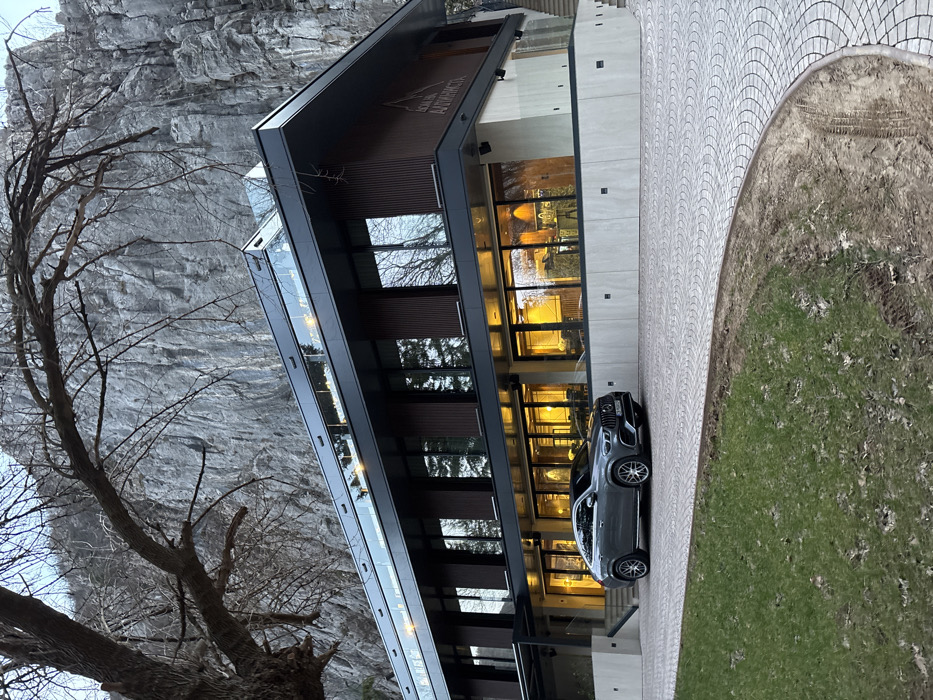 A modern, multi-story building identified as "ДОМ НА АЛПИНИСТА" (Alpinist's House) is situated at the base of a massive, light-grey limestone cliff in Vratsa, Bulgaria. The building features dark paneling, extensive reflective glass windows, and a glass-railed upper level, with the ground floor interior illuminated by warm artificial light. A dark grey Mercedes-Benz AMG GLE Coupe, bearing a Bulgarian license plate (beginning with "ВР"), is parked on a curved, light-colored paver driveway in front of the building. A large, bare-branched deciduous tree occupies the left foreground, partially obscuring the cliff face. The immediate foreground consists of a patch of green grass and exposed soil. The scene appears to be under natural light, possibly dusk or dawn, with no individuals visible.