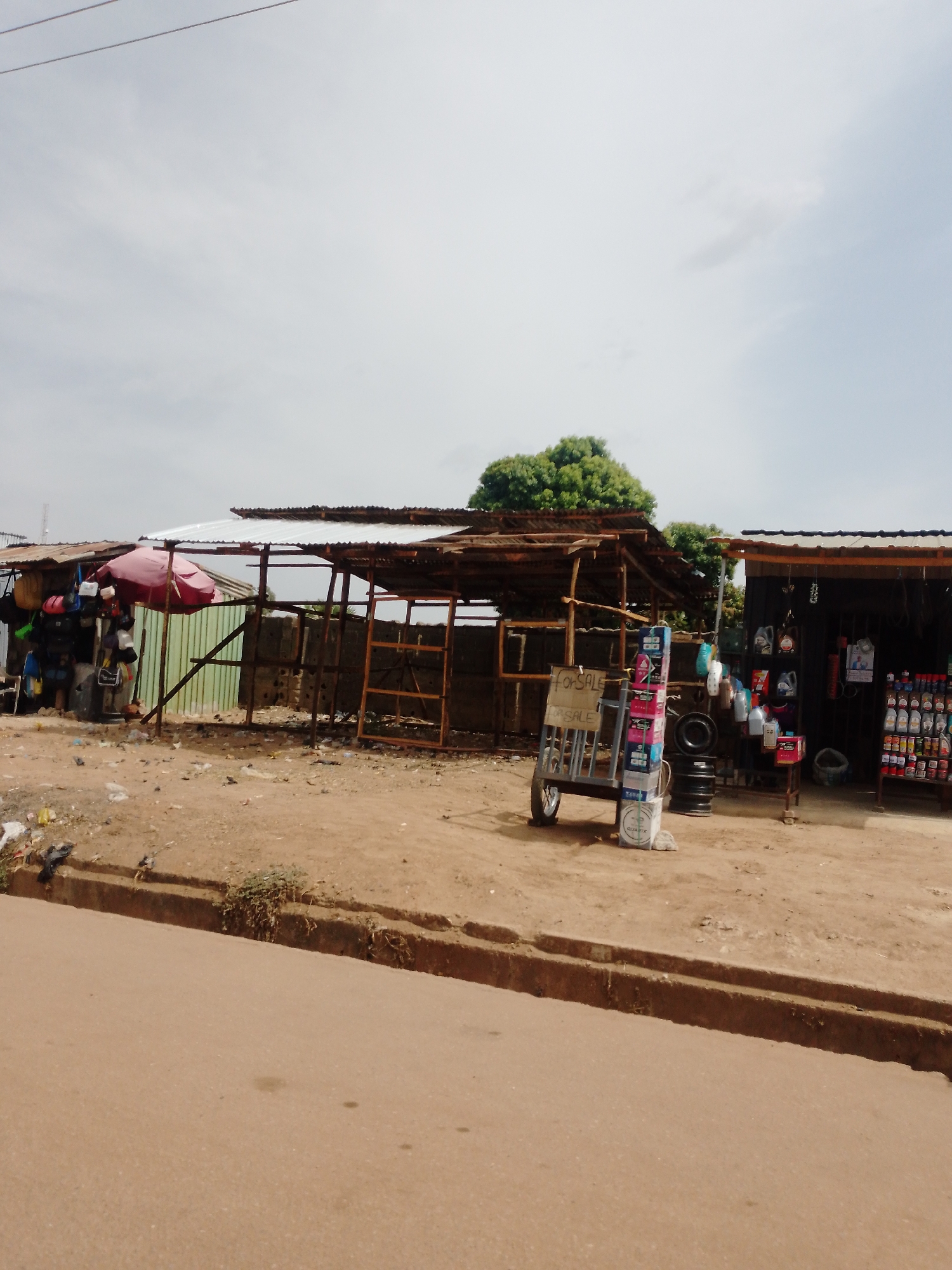 The image depicts a street scene in Yelwa, Nigeria, characterized by rudimentary commercial structures under a light grey, overcast sky