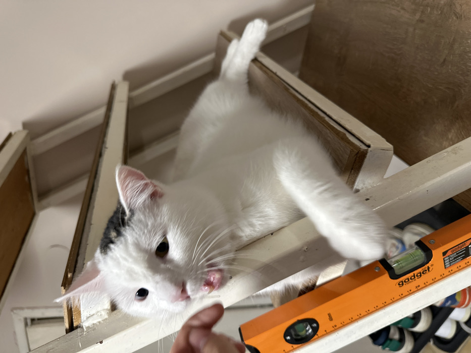 The scene depicts a residential interior in Burgas, Bulgaria. A white domestic cat, featuring a prominent dark gray or black patch on its head, is positioned on a light-colored, unfinished wooden stair tread or shelf. The cat is shown facing left, with its mouth open, revealing its teeth and tongue, in an apparent interaction. A light-skinned human hand, with several fingers visible, extends from the left side of the frame towards the cat's mouth area. Immediately below the human hand, an orange "gadget" branded spirit level is held vertically, partially visible. The background consists of a plain, light-colored wall and a rudimentary, light-painted wooden shelving or stair structure. In the lower-left background, beneath the level, a shoe rack containing multiple pairs of shoes is faintly discernible.