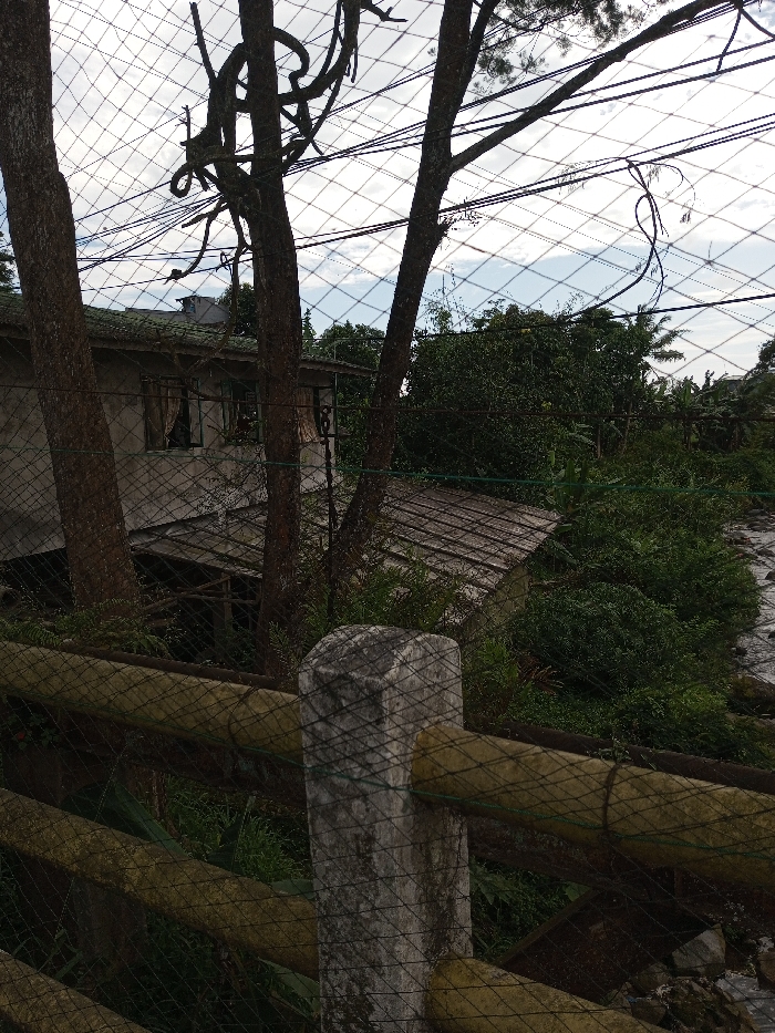 The image presents an outdoor scene in Ariyalai, Sri Lanka, observed through a fine mesh netting. In the immediate foreground, a weathered concrete fence post is visible on the right, supporting horizontal wooden rails that are wrapped in a similar green-hued netting. This netting extends across the entire frame, acting as a partial visual filter. Behind the netting and fence, several dark-barked tree trunks rise vertically, their branches, some gnarled and leafless, extending upwards and intertwining with the netting. In the midground, a two-story building with a light-colored, possibly stucco or concrete, exterior is partially visible through the trees and netting. The upper floor displays windows with dark frames and interior curtains. Below and to the right of this main structure, a smaller building with a corrugated metal roof is discernible, surrounded by dense green foliage. The terrain slopes downwards from left to right, heavily vegetated with various green plants, bushes, and smaller trees. On the far right, a narrow body of water, consistent with a river or stream, is visible, flowing past the dense greenery. The background features additional dense tree cover, including some taller trees that resemble palms. The sky is overcast with a mix of white and light blue clouds. No individuals or active interactions are visible within the scene.