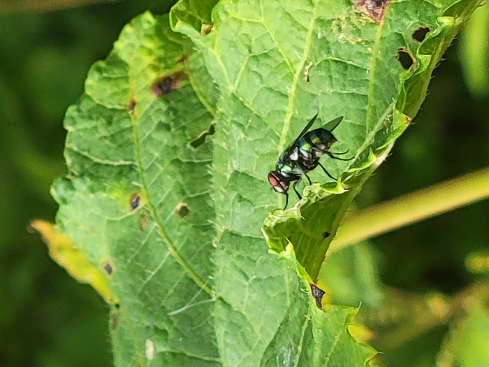 - "A metallic green blowfly, characterized by prominent red compound eyes and an iridescent segmented body, is positioned on the upper surface of a vibrant green leaf" by FM-ZlnEa2, licensed under CC BY 4.0
