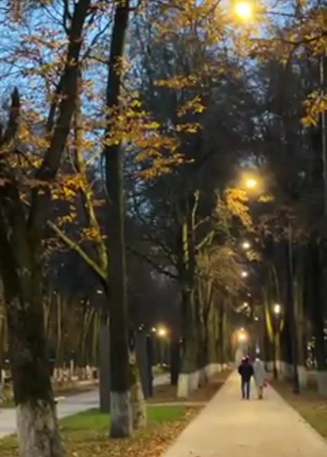 A low-angle shot shows an autumnal park at dusk. A wide, paved path stretches into the distance, lined on both sides by tall trees. The trees are mostly bare, but some retain golden leaves illuminated by the warm glow of streetlights. Two figures walk away from the viewer down the path, their forms silhouetted against the fading light. A third person walks in the opposite direction on a path parallel to the main one. Fallen leaves are visible on the ground. The sky above is a muted blue.