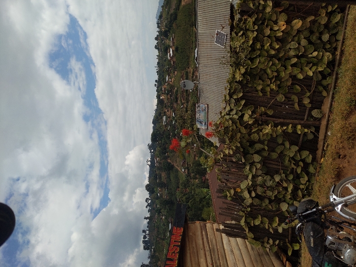 The scene depicts a panoramic view of a hilly, vegetated landscape in Bwasinge, Democratic Republic of the Congo, under a partly cloudy sky. In the immediate foreground, a black motorcycle with a silver front wheel is parked on a dirt surface at the bottom left. To its right, a rustic wooden fence constructed from vertical slats is heavily covered by a dense vine with numerous green leaves. Red flowers are visible above the fence. Behind the fence and below the horizon, a corrugated metal roof is present, featuring a small white satellite dish and a square solar panel. To the far left, a light-colored wooden structure or building, composed of horizontal planks, displays partial text that reads "PALESTINE." The midground and background consist of rolling hills densely covered in green vegetation, interspersed with numerous scattered houses and structures, indicating a populated rural or semi-urban area. No individuals are visible in the image.