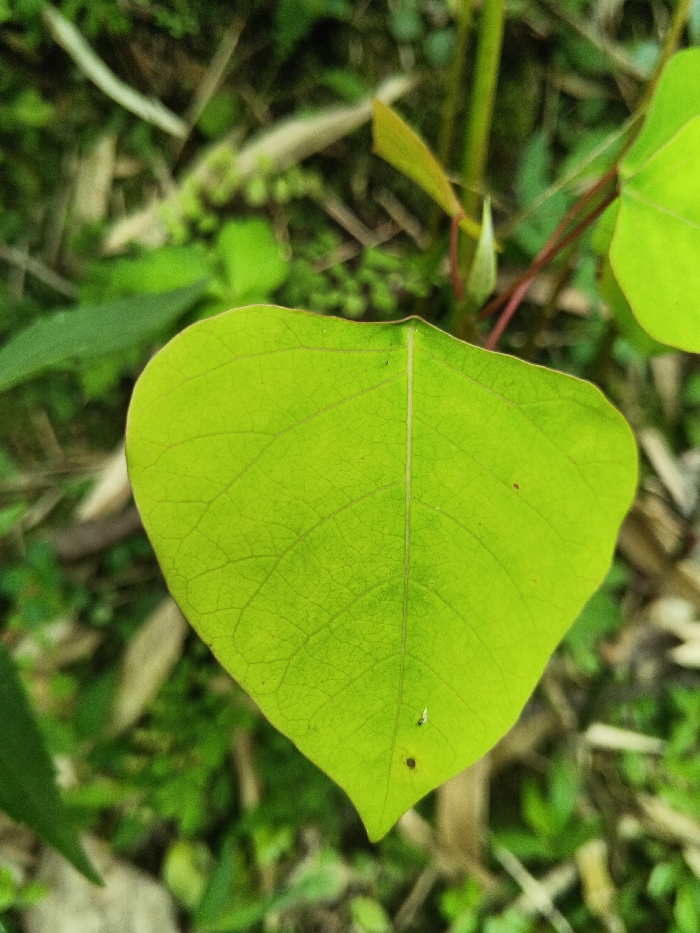 This image, captured in the city of Soibada, East Timor, presents a close-up, top-down view of a single, vibrant light-green leaf, centrally positioned. The leaf is broad, with a rounded, slightly ovate morphology, displaying prominent reticulate venation and a distinct central midrib. A reddish-brown petiole is visible connecting the leaf to a main stem, also reddish-brown, from which new green growth or buds are emerging above the leaf. The leaf surface exhibits a small, dark, punctate mark on its lower right quadrant and a tiny, pale, elongated speck near its bottom edge. The background consists of heavily blurred, out-of-focus green and light brown vegetation, consistent with an outdoor natural environment featuring ground cover and other plant material.