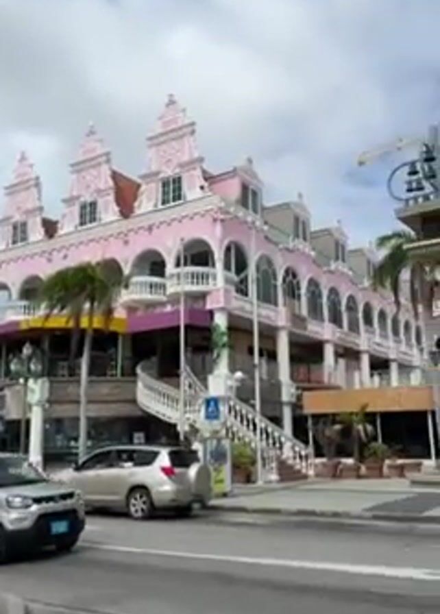 street in what appears to be a tourist area. The street is lined with shops and restaurants, some with brightly colored facades in a European style. Traffic is moderate, with several cars driving on the road. There is a crosswalk in the foreground and a pedestrian walking on the sidewalk. A construction crane is visible in the background. The sky is partly cloudy. Street signs and light posts are also visible.