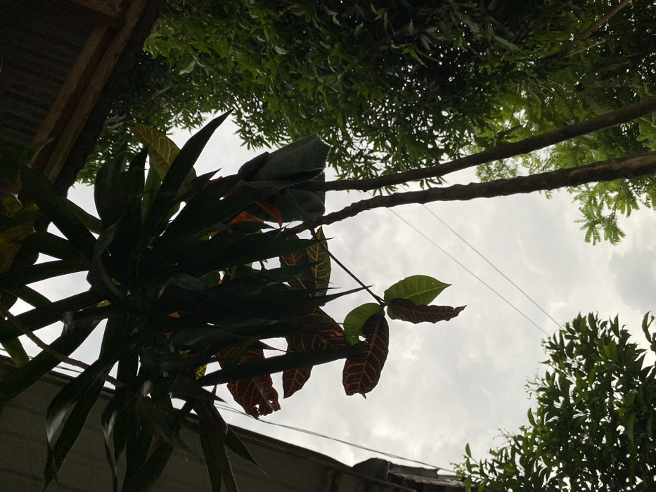 The image provides an upward view of an outdoor scene in Lhokseumawe, Indonesia, under an overcast sky. In the immediate foreground, dense, dark green foliage from a large plant, identifiable by its variegated leaves with prominent reddish-green patterns, occupies the upper portion of the frame. A light grey, folded towel is draped over a stem or branch within this foliage on the right side. Architectural roofing elements, including a corrugated section and a wooden beam, are visible along the upper left and right edges. The background consists of a predominantly white and grey sky with visible cloud formations. Two thin, dark utility lines traverse the sky diagonally from the mid-left to the mid-right. Dense green foliage from larger trees is visible on the far right and lower left, along with two slender, vertical tree trunks or thick stems extending upwards on the mid-right. No individuals, explicit actions, or interactions are depicted.